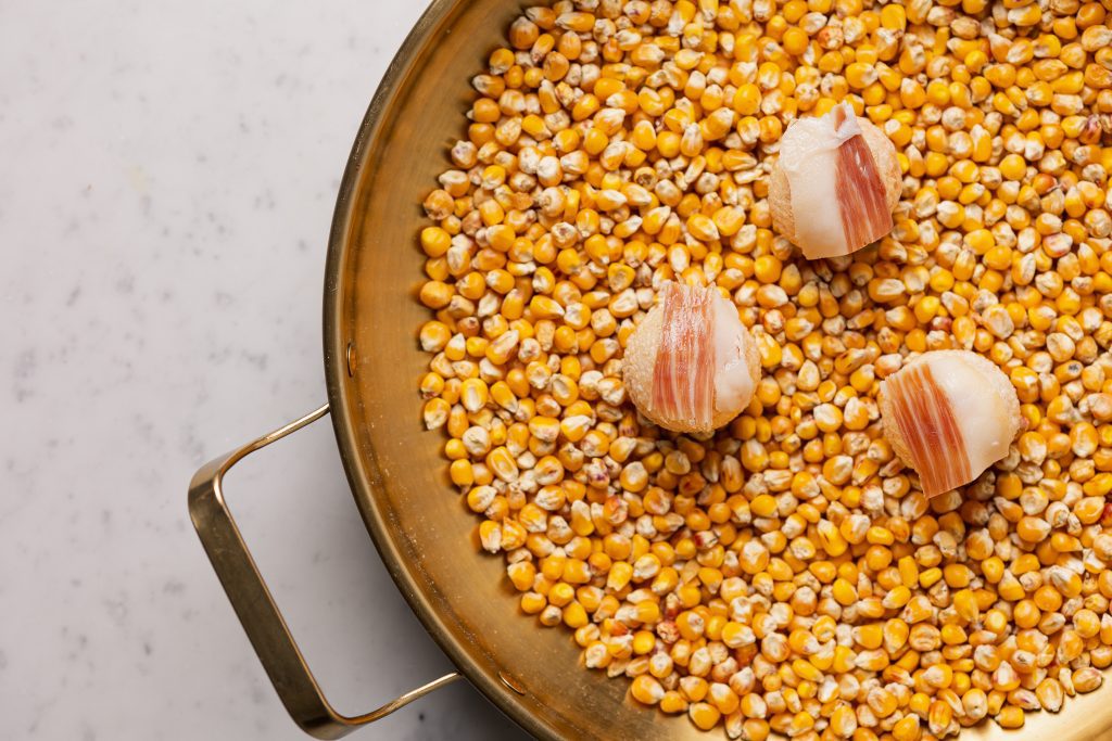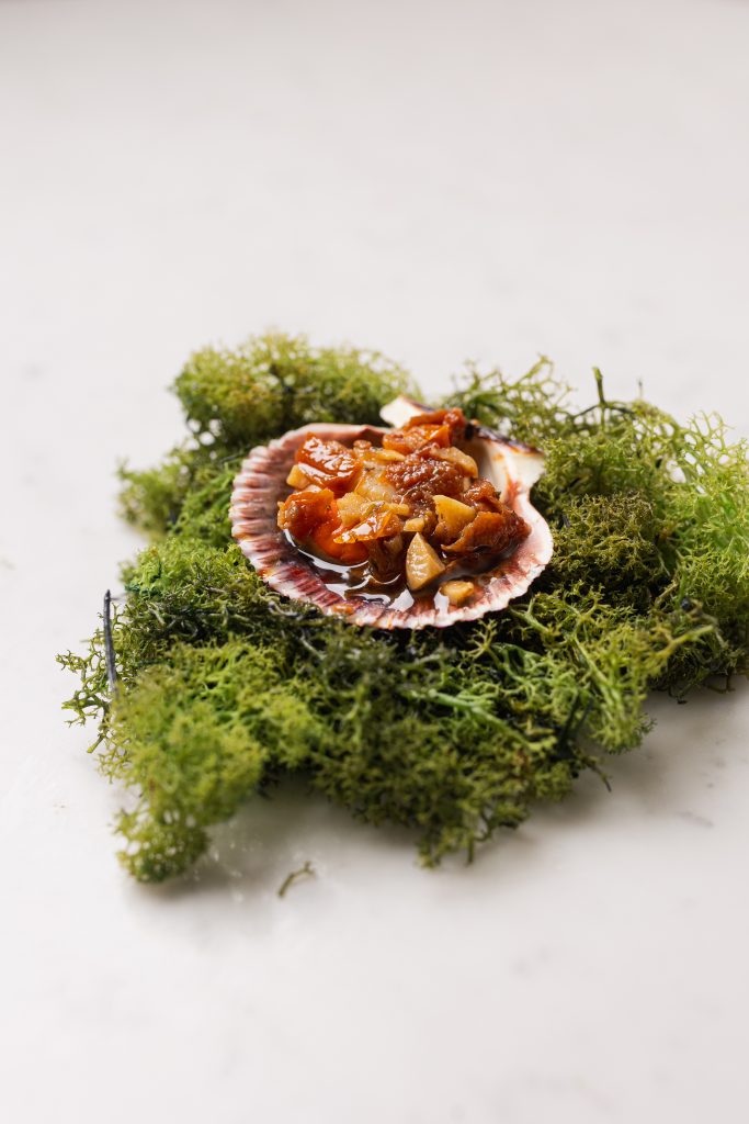 Vieiras asadas sobre crema de beurre blanc de palo cortado, “migas” de jamón y langostinos.
