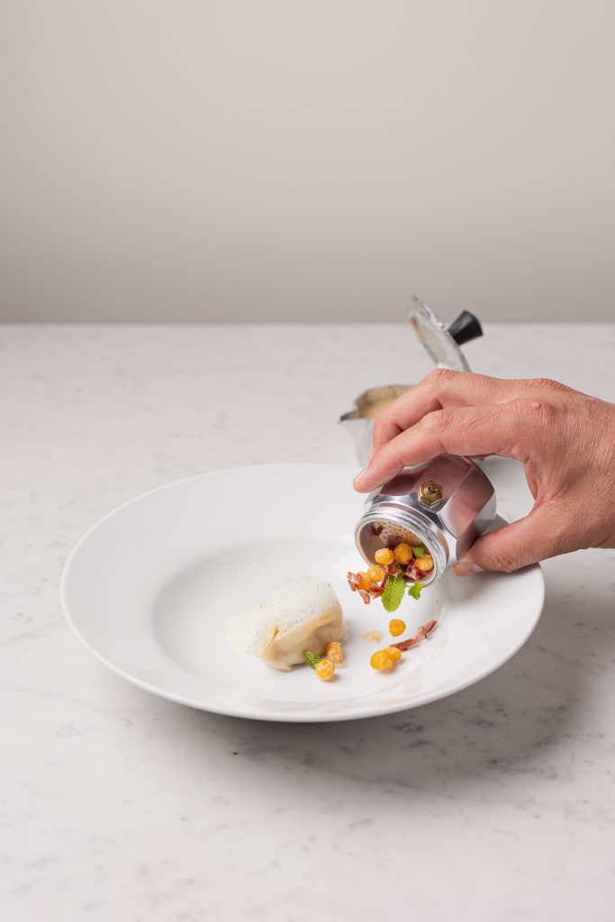 • Terciopelo de salmorejo sobre caparazón de centolla, su carne y tallarines de oloroso, huevo y jamón