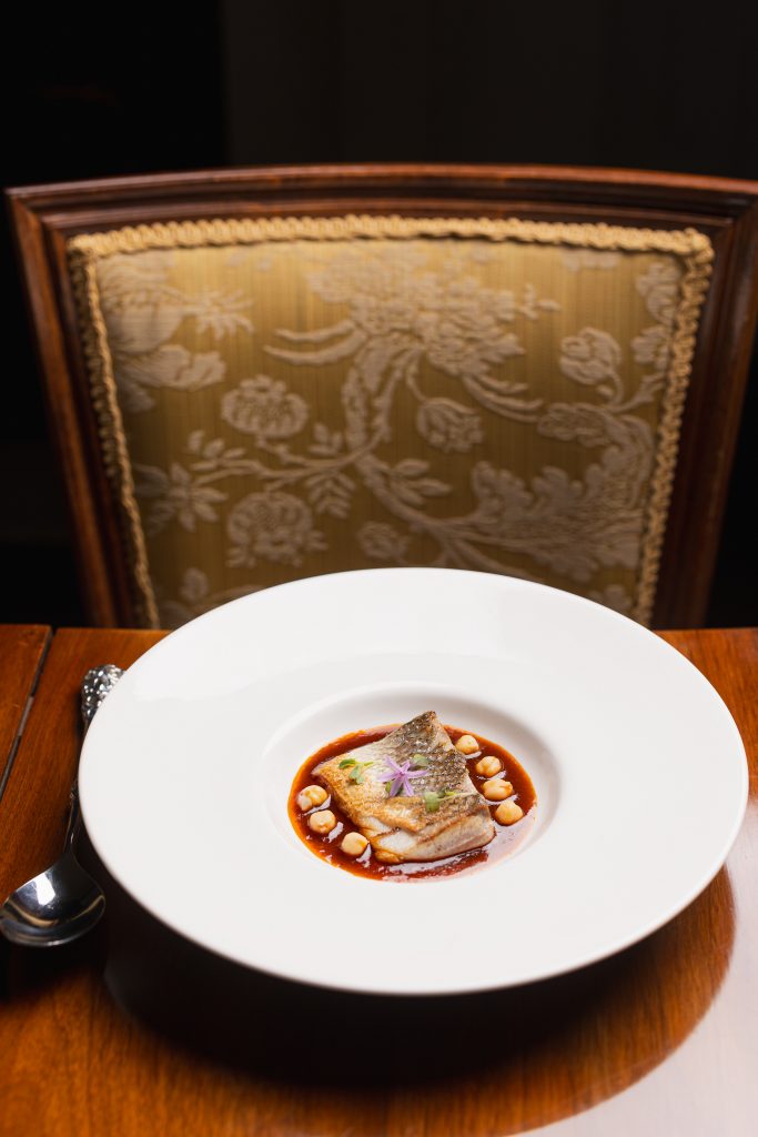 • Lubina con patatas confitadas en mantequilla cítrica, piñones y albahaca